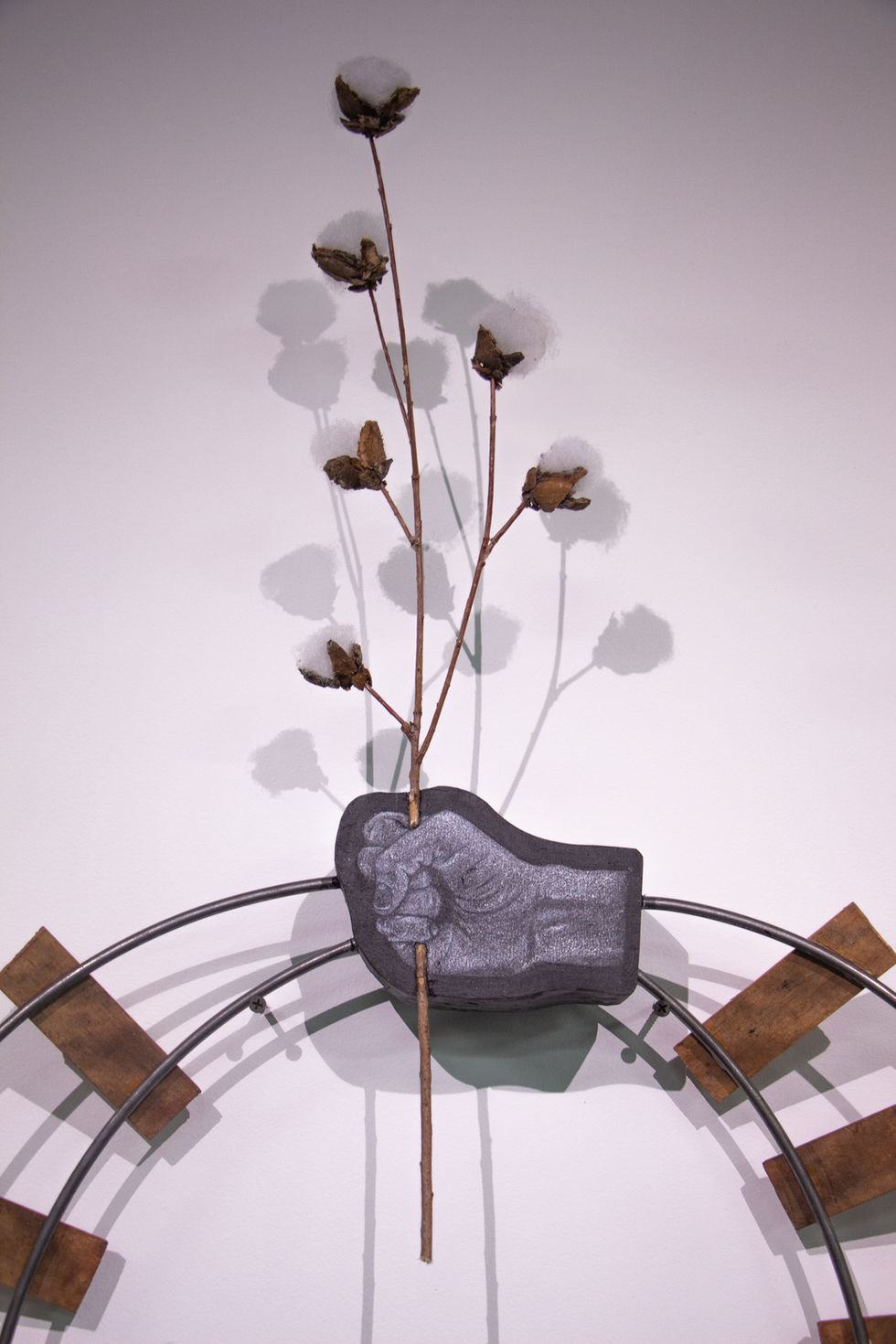 Prairie Switch recounts the socioeconomic and personal familial history of El Campo, Texas, reflecting on the ancestral significance of liminality and generational distance between migration, tradition, and homeland. Metal rails are welded and faceted with wooden planks into a wreath-shape, wooded blocks that have been drawn and sculpted are placed at the top and bottom of the sculpture, holding significant artifacts.